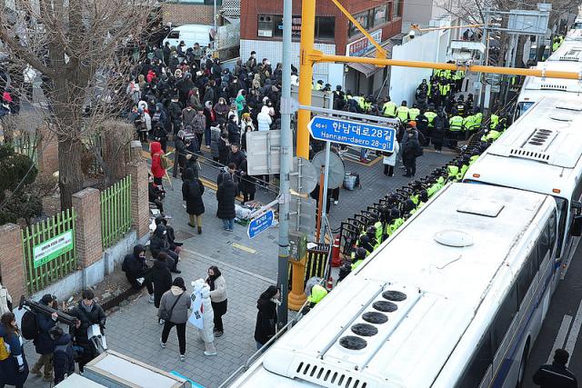 △1月3日,位于韩国首尔的总统官邸外,韩国公调处调查人员当天进入总统官邸,尝试逮捕尹锡悦。